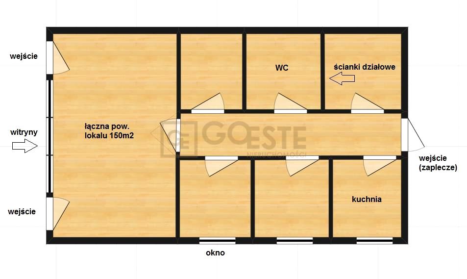 Posiada trzy wejścia (dwa od frontu, jedno od zaplecza). Lokal składa się z sali sprzedażowej, zaplecza (6 pokoi) i łazienki z WC. Istnieje możliwość dowolnej aranżacji wnętrza (ściany karton-gips).