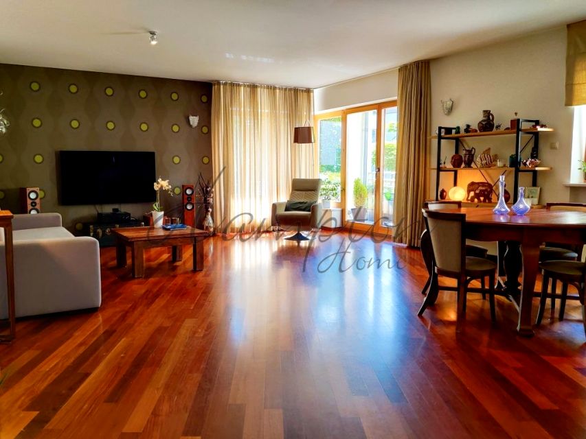 W pokojach parkiet egzotyczny IPE/Lapacho, w pozostałych pomieszczeniach gres. Drzwi wewnętrzne fornir orzech amerykański, szafy w przedpokoju palisander.