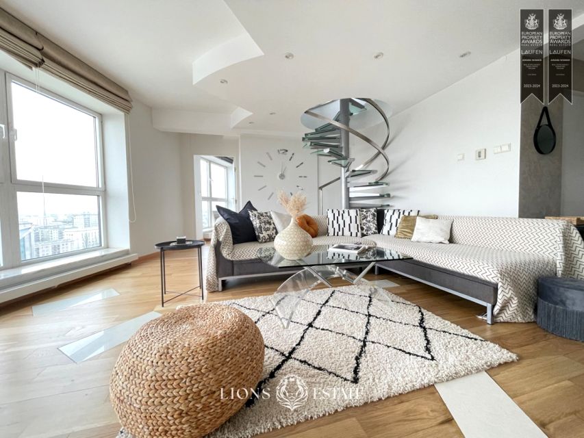 Apartament znajduje się na ostatnim - siedemnastym piętrze apartamentowca. Jest umeblowany oraz wykończony w wysokim standardzie. Ma powierzchnię 180 m2 na które składają się 2 sypialnie, salon, oddzielona kuchnia oraz 2 łazienki. (...)