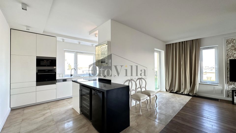 Bardzo wygodne, ciche mieszkanie na strzeżonym zamkniętym osiedlu. Apartament wykończony i umeblowany w wysokim standardzie. Podłogi wykonane z wysokiej klasy litego dębu olejowanego. W hallu, kuchni i łazienkach posadzka ceramiczna z ogrzewaniem podłogowym. Mieszkanie ogrzewane grzejnikami wpuszczonymi w podłogę z dodatkowym nadmuchem. (...)