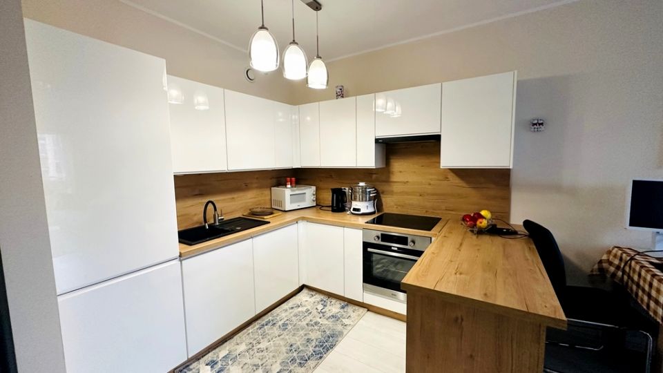 - Wyposażenie: mieszkanie umeblowane, telewizor, pralka, zmywarka, płyta gazowa / elektryczna, kuchenka mikrofalowa, piekarnik, lodówka