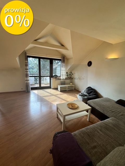 The large living room with sloping ceilings has a balcony facing west, onto Nowoursynowska Street, which is sheltered by beautiful pine trees growing in the garden.