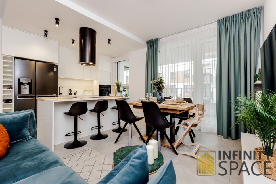 Mieszkanie ma powierzchnię 83,2 m2 i znajduje się na 2. piętrze budynku. Mieszkanie jest bardzo jasne, rozkładowe z ekspozycją na południe, co gwarantuje odpowiednie doświetlenie mieszkania w ciągu dnia. Mieszkanie zostało wykończone w nowoczesnym stylu w podwyższonym standardzie i wyposażone we wszystkie niezbędne sprzęty RTV i AGD (zmywarka, piekarnik, płyta indukcyjna, okap, lodówko-zamrażarka, pralka, telewizor, wszystkie sprzęty małego AGD oraz naczynia). W mieszkaniu przewidziano wszystkie strefy konieczne do komfortowego funkcjonowania na co dzień, a oddzielna garderoba w sypialni oraz liczne szafy w zabudowie zapewnią wystarczającą ilość miejsca do przechowywania.